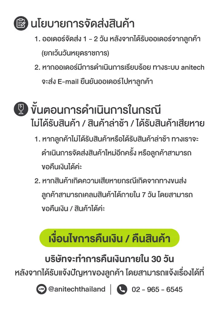 1.1) ผลิตถัณฑ์ และ อุปกรณ์เสริมต่างๆ ของแบรนด์ anitech (แอนิเทค) จะได้รับการรับประกันในกรณีที่อาการชำรุดเกิดจากความผิดพลาดของตัวสินค้าอันเนื่องมาจากความผิดพลาดที่มาจากการผลิตเท่านั้น