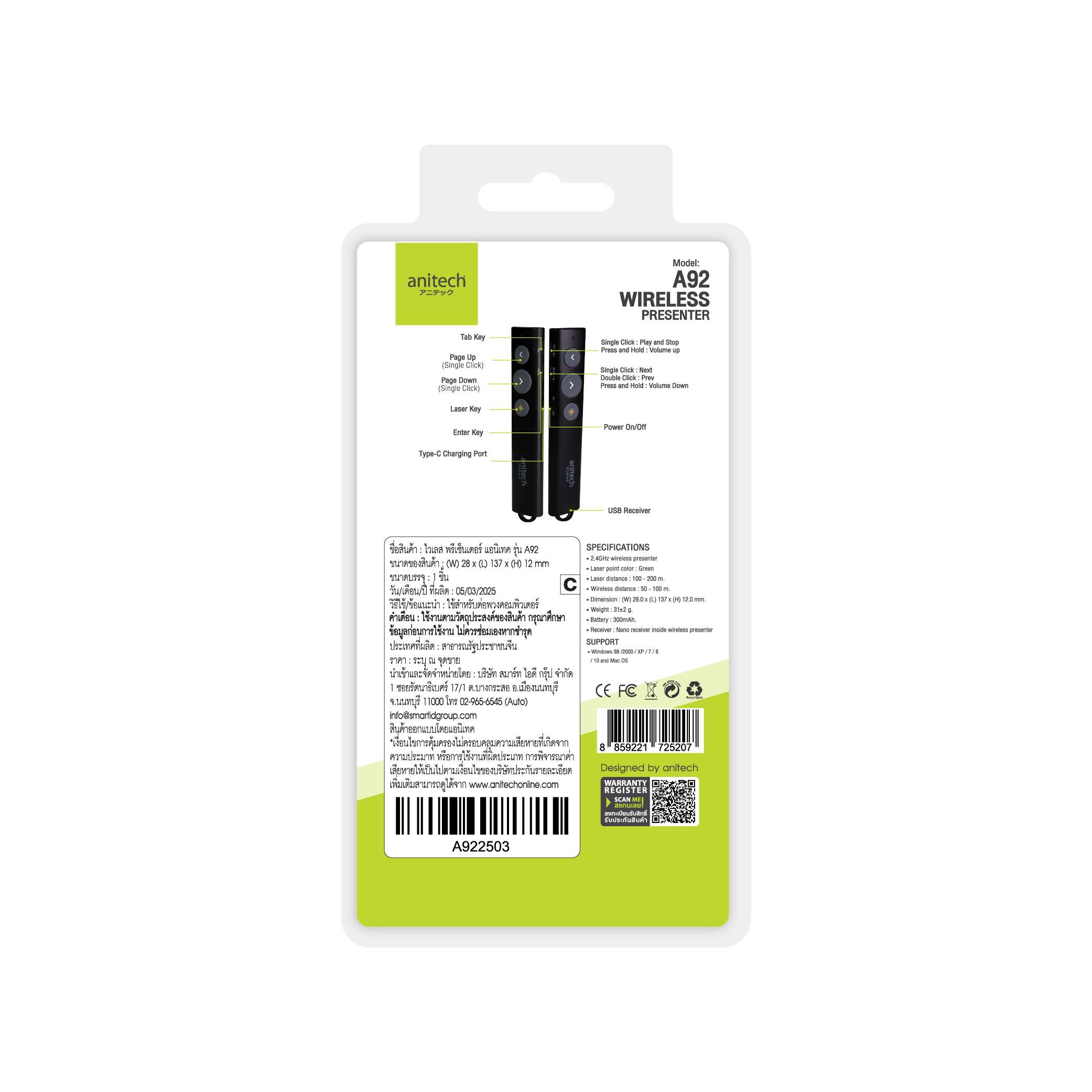 Anitech เลเซอร์พ้อยเตอร์ ไวเลส แสงสีเขียว รุ่น A92 ใช้ได้กับสมาร์ททีวี/จอดิจิตอลต่างๆ ระยะการแสงไกล 100-200 เมตร