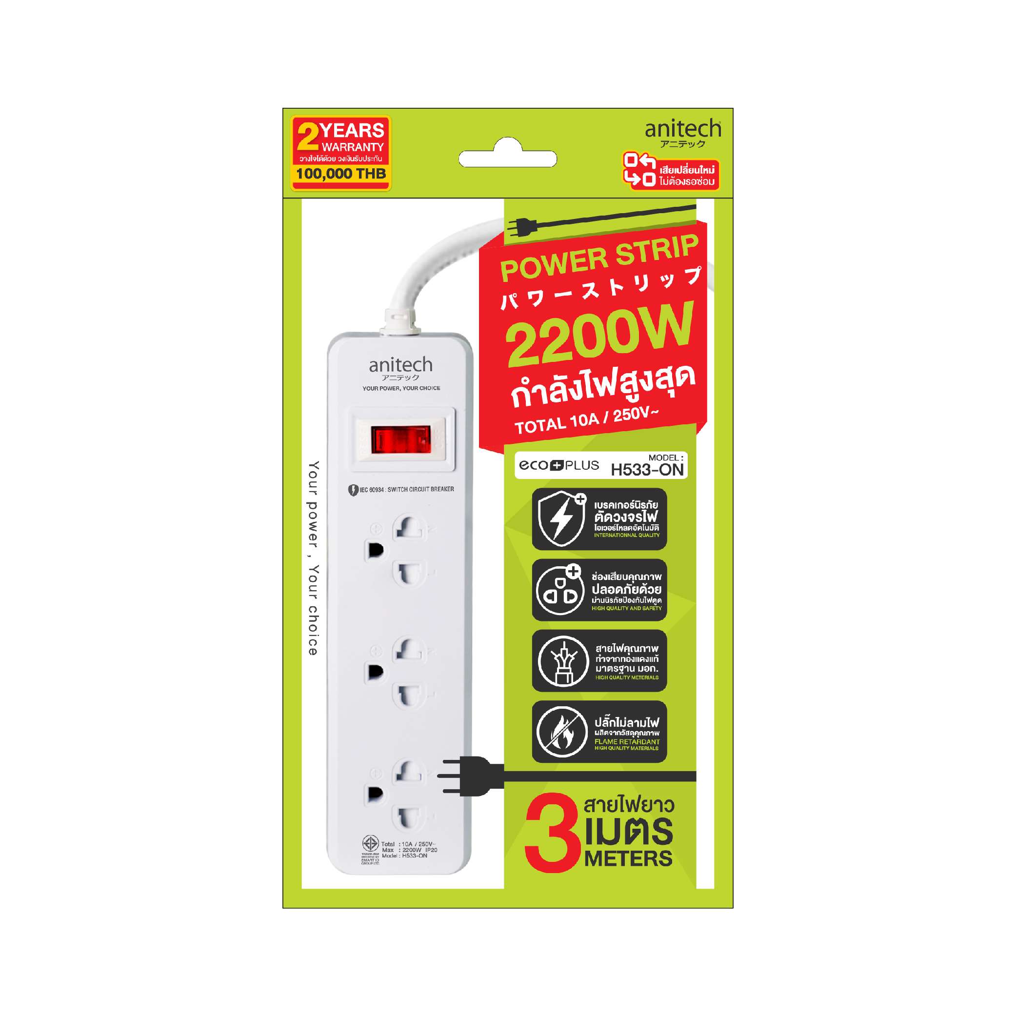 Anitech ปลั๊กไฟ 3 ช่อง 1 สวิตซ์ รุ่น H533-ON รองรับกำลังไฟสูงสูงสุด 2200 วัตต์ 10 แอมป์
