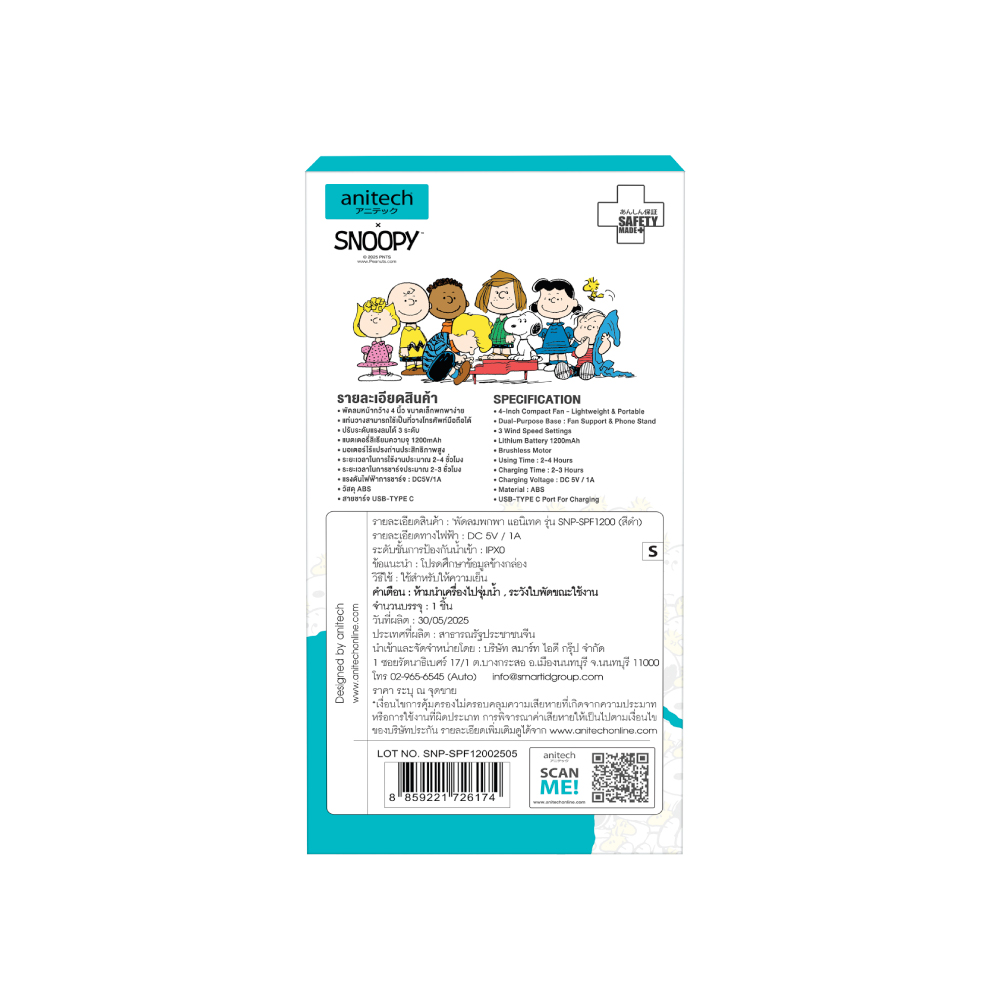 Anitech พัดลมพกพา SNP-SPF1200-BK ปรับได้ 3 ระดับ ใช้งานประมาณ 2-4 ชั่วโมง