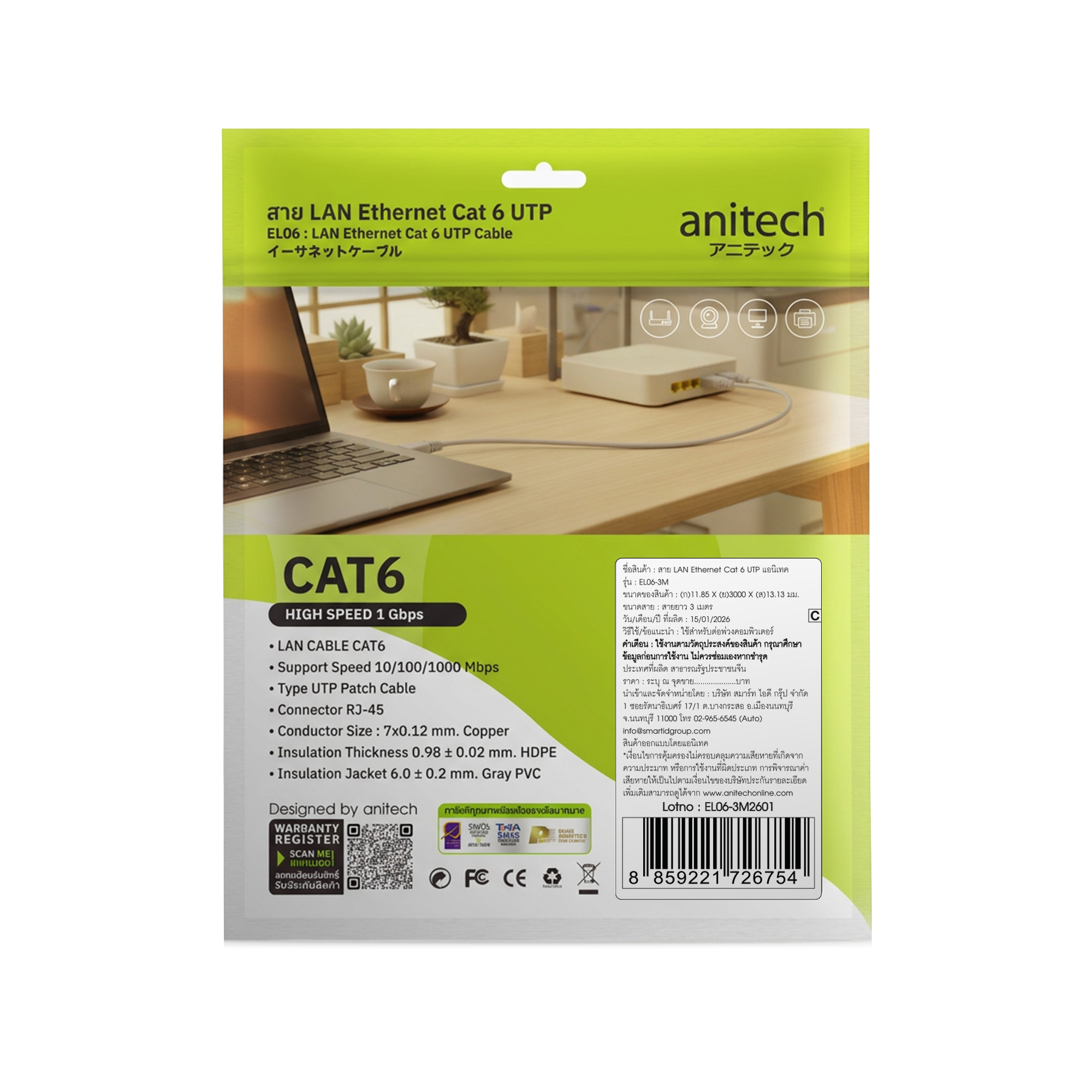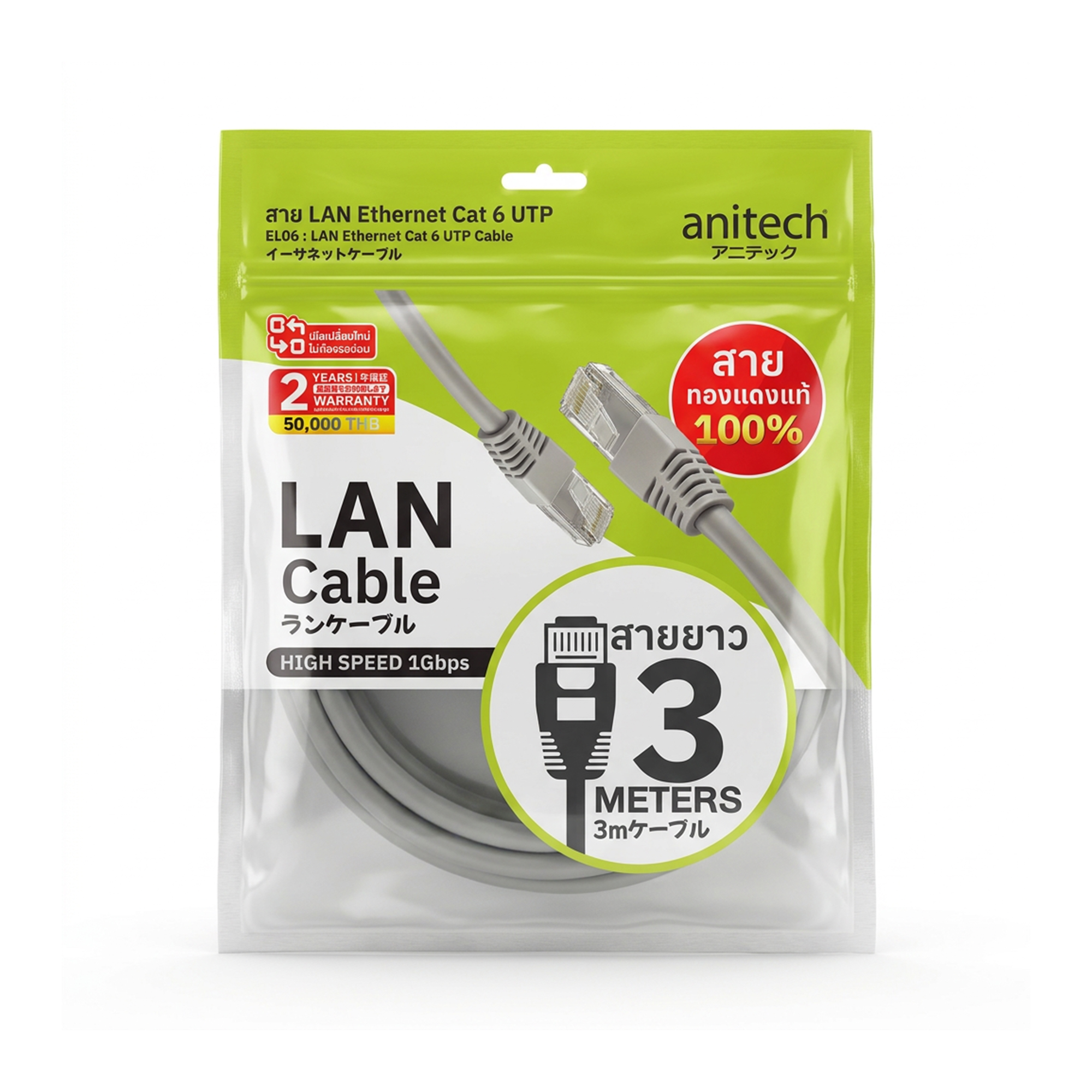 Anitech สาย LAN Ethernet Cat 6 UTP รุ่น EL06-3M สายทองแดงแท้ รองรับ Gigabit 1000Mbps