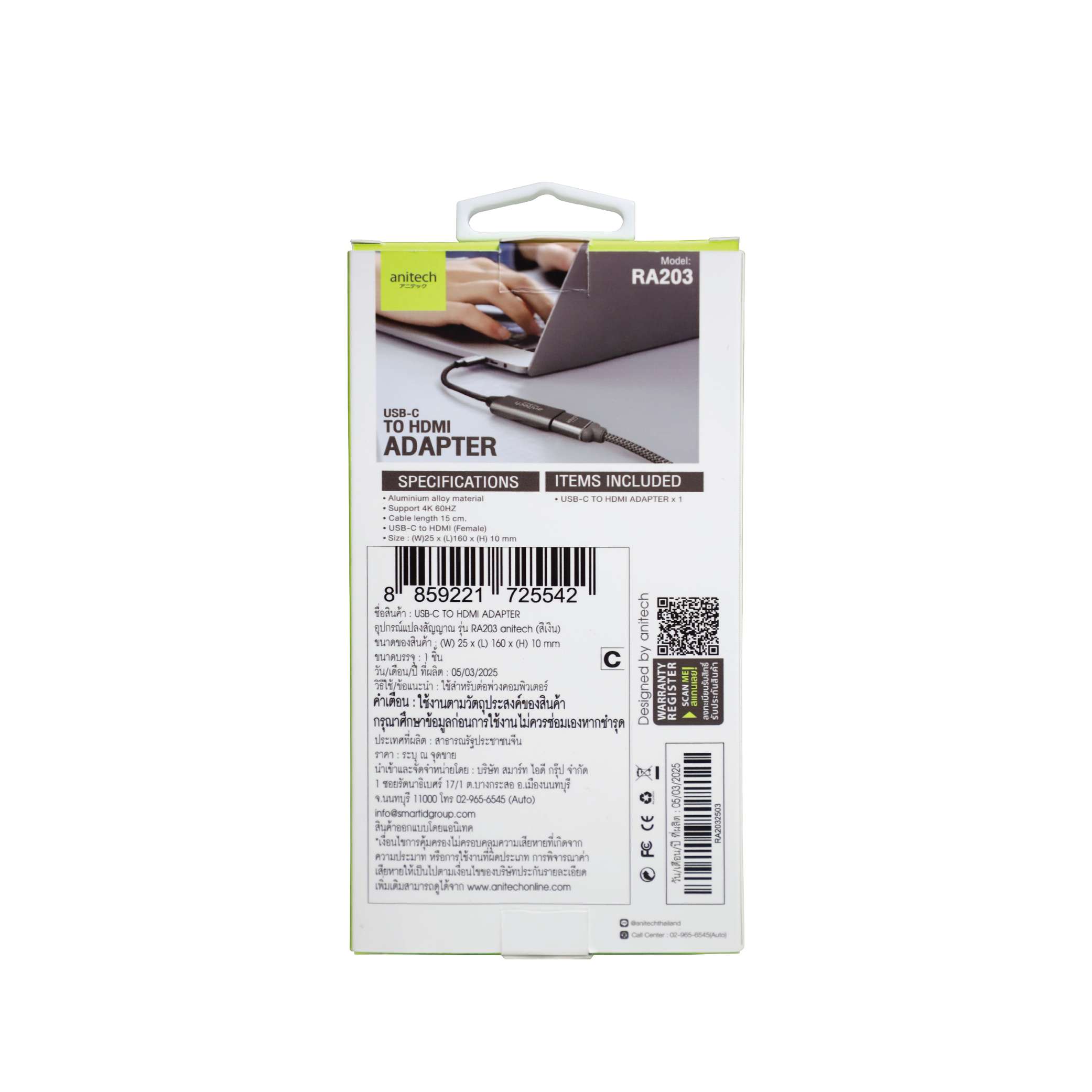 Anitech USB-C to HDMI ADAPTER รุ่น RA203 ความยาวสาย 15 ซม