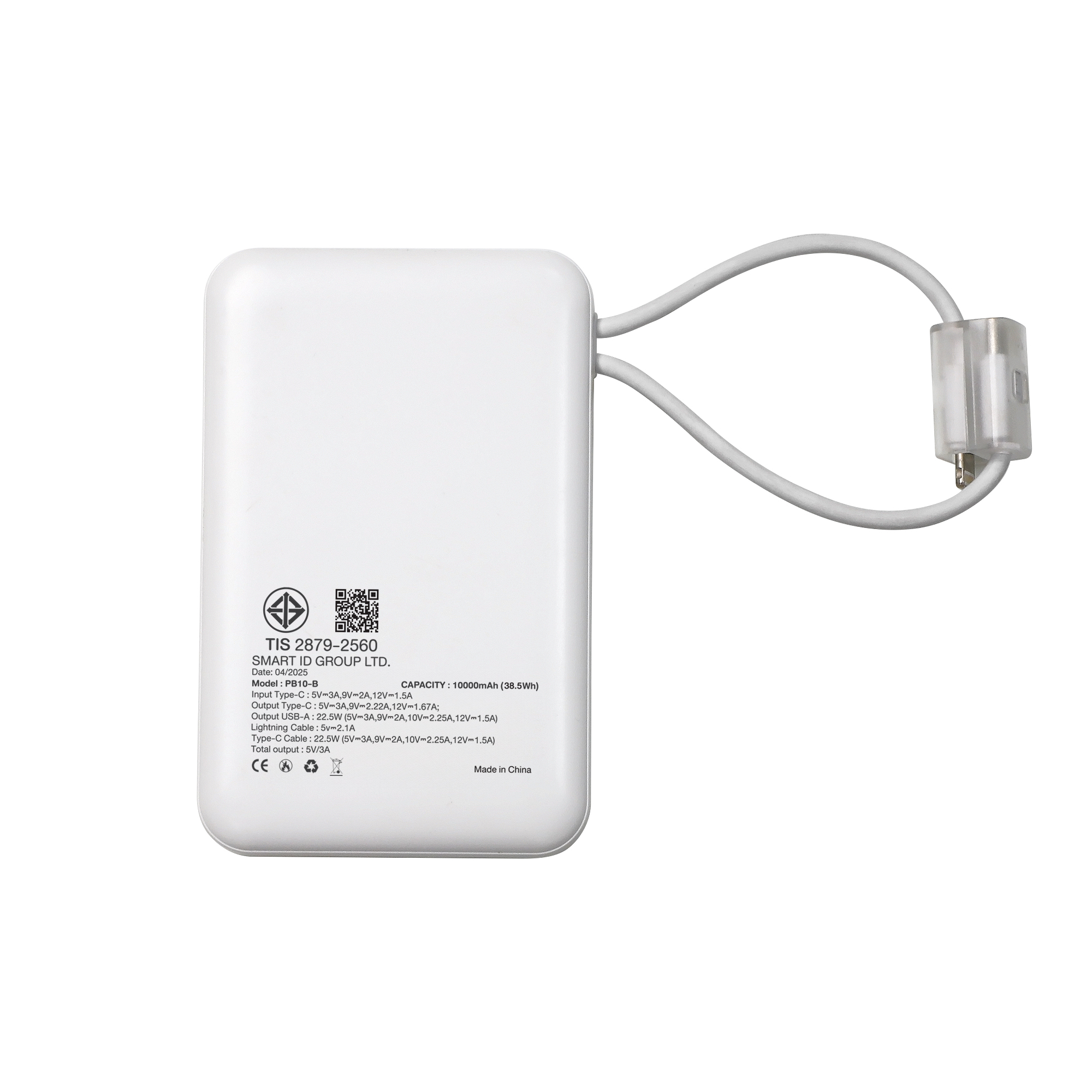 4. สายชาร์จในตัว:- สาย Lighning: 5V⎓2.1A- สาย Type-C: 22.5W (5V⎓3A, 9V⎓2A, 10V⎓2.25A, 12V⎓1.5A)
