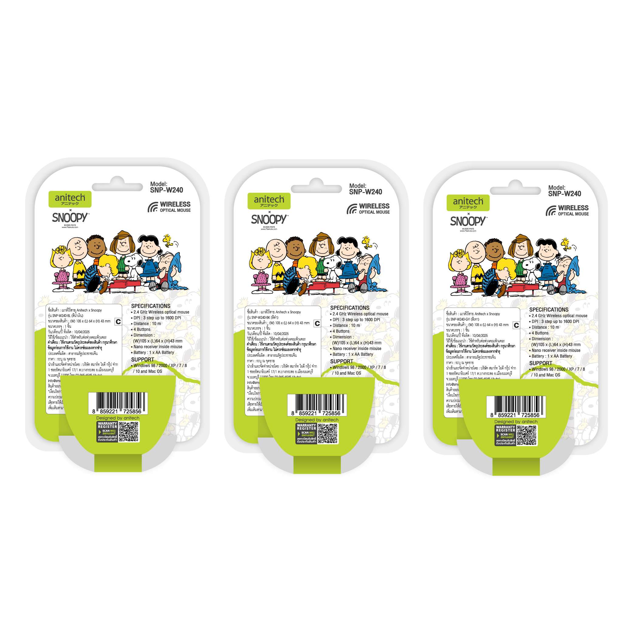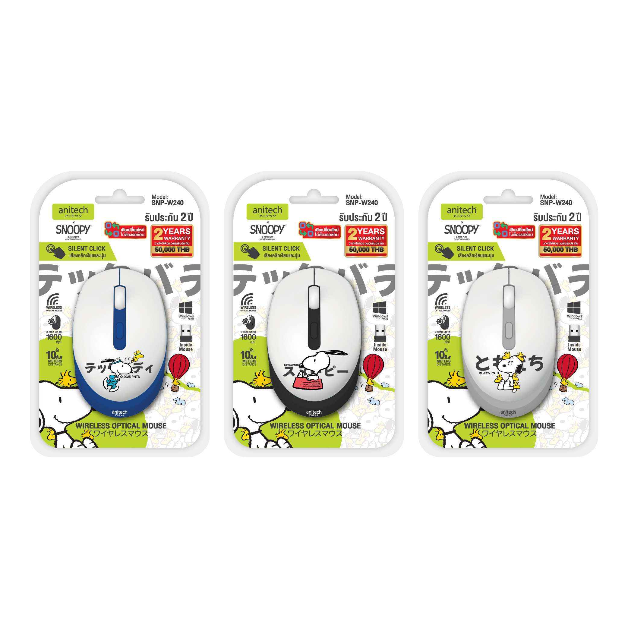 Anitech X Snoopy 3 เม้าส์ไร้สาย รุ่น SNP-W240-BL คลิกเงียบ เชื่อมต่อแบบ USB ปรับ DPI 3 ระดับ