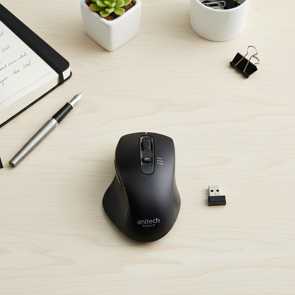 2.4GHz Wireless optical mouse Resolution : 800/ 1200/ 1600 DPI Distance : 10 m. Button : 4 Buttons Key life : 5 Million times LED : Rainbow color Receiver : Nano receiver inside mouse Battery : 1x AA battery